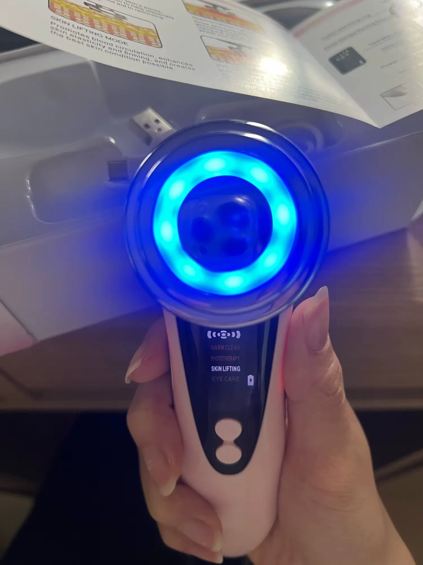 الجهاز يشتغل تمام وجا معاه تعليمات. فيه أكثر من وضع، والإضاءة والاهتزاز تشتغل. أستخدمه بالليل – وبصراحة بشرتي صارت أنعم لما ألمسها. راضية جدًا عن الطلب